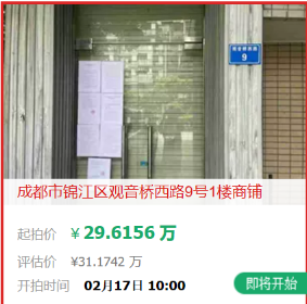 以下資產(chǎn)是位于錦江區(qū)觀音橋西路的17套商鋪及1套住宅(可單個購買),已在淘寶上進(jìn)行司法拍賣,歡迎大家關(guān)注“阿里資產(chǎn)”并參與競拍,標(biāo)的物為,將于2024年2月17日-18日開拍,歡迎大家關(guān)注,詳情請掃描二維碼。
